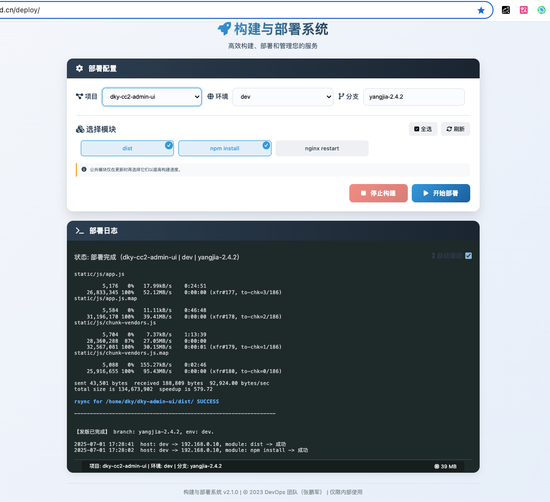 增加前端项目部署(toolbar、admin-ui、sdk2),支持依赖安装、项目打包发版、nginx重启 ,3 大操作按需发布