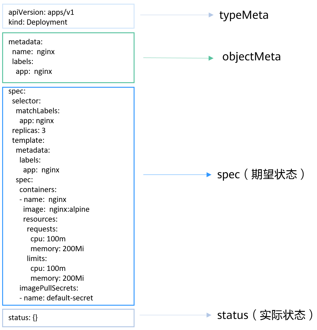 spec:对象的期望状态,例如对象使用什么镜像、有多少副本等。