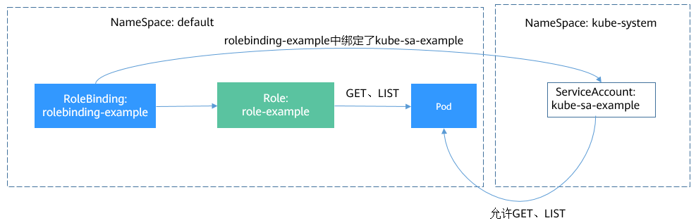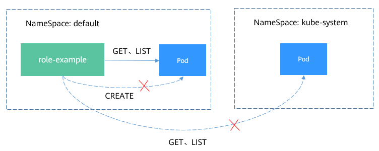 Role和RoleBinding作用的范围是命名空间,能够做到一定程度的权限隔离,如下图所示,上面定义role-example就不能访问kube-system命名空间下的资源。