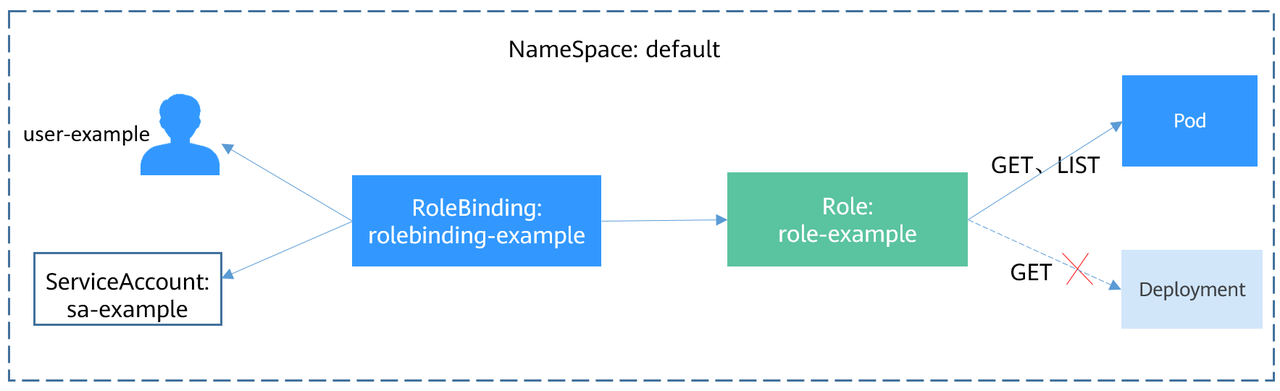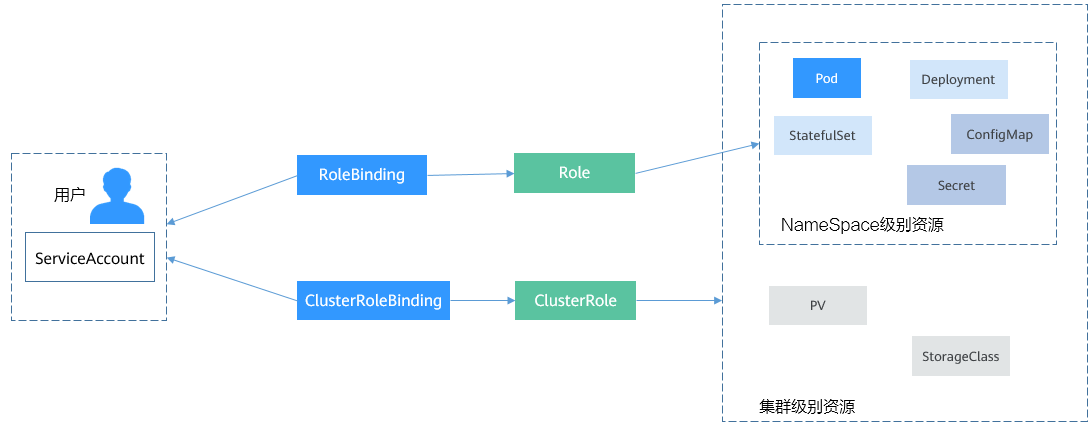 这里的subjects就是将Role与用户绑定起来,用户可以是外部普通用户,也可以是ServiceAccount,这两种用户类型在ServiceAccount有过介绍。绑定后的关系如下图所示。